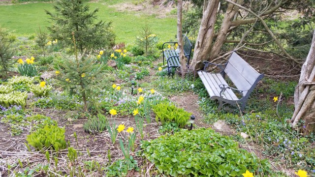 Every year I expand it. There are four seating areas. I have three benches out in the sun and rain, and one under a shelter so I can even sit out there in the damp. (I have to walk through a roof drip line to get there, but pish–it is nothing.)